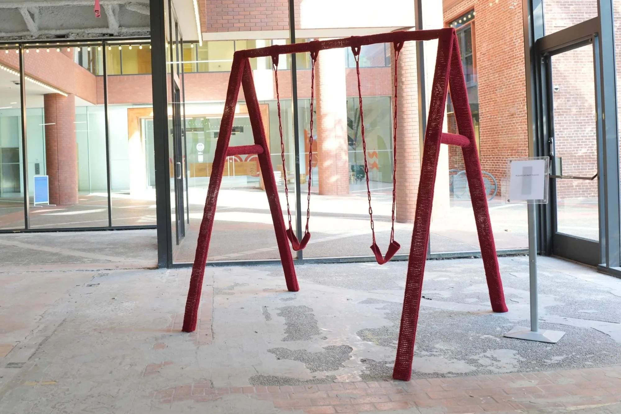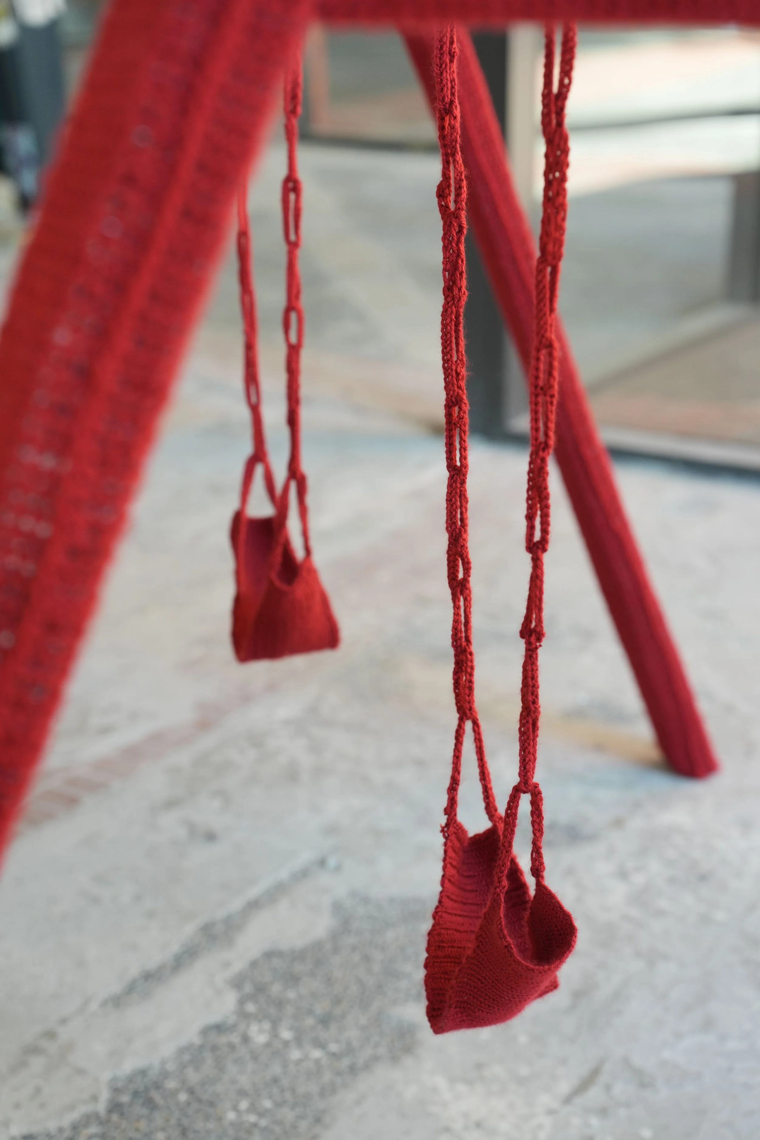 This work transforms a ubiquitous playground structure into an object of memory and absence. The swing set, a form tied to childhood play and collective nostalgia, is wrapped entirely in red yarn.